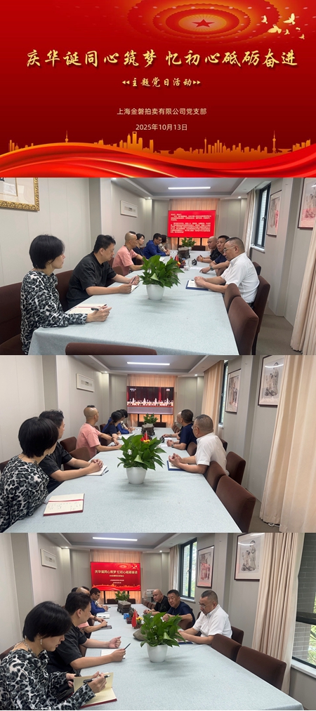 2025年10月13日,金磐拍卖党支部在公司会议室组织开展以"庆华诞同心筑梦 忆初心砥砺奋进"主题党日活动,专题学习习近平总书记在纪念中国人民抗日战争暨世界反法西斯战争胜利80周年大会上的重要讲话精神。
